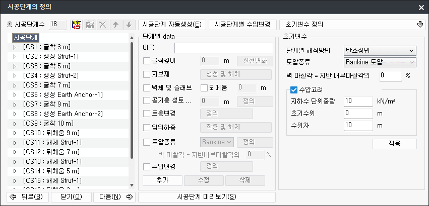 지반의 굴착 및 지보재의 설치/해체, 구조물 생성에 대한 시공순서를 묘사하여 해석에 반영합니다. 수압, 임의하중 등의 추가하중을 시공단계별로 고려합니다. 정의된 단계별 data는 별도의 변경이 없으면 다음 시공단계에서도 계속 유지되므로, 시공단계에 따라 변경되는 부분만 추가 입력합니다. -
