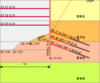 - 구간에서 입력한 구간너비가 합산됩니다. 굴착저면의 선형변화를 고려할 때, 계산폭은 굴착폭보다 작거나 같게 입력해야 합니다.