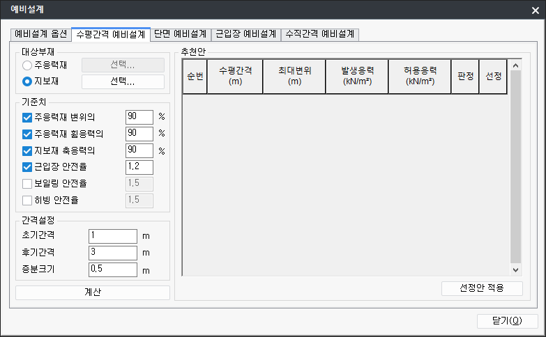 지보재 : '지보재의 정의'에서 정의된 지보재에 대해서 선택이 가능하고 선택된 지보재에 대해서만 수평간격이 적용됩니다.