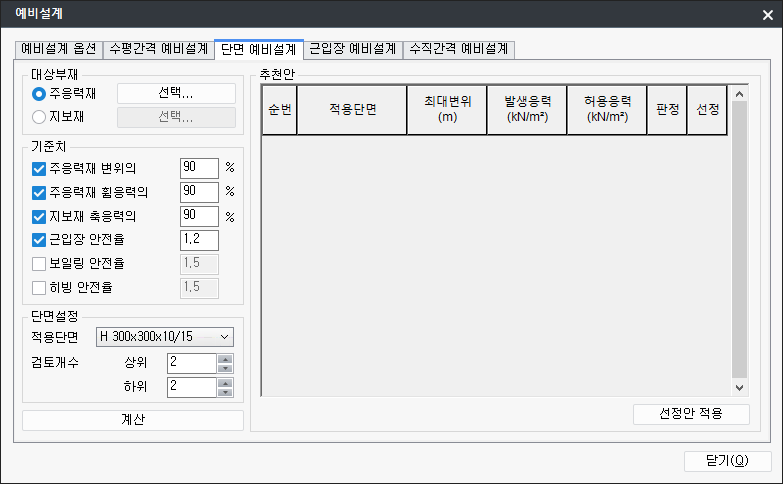 - 검토개수: 단면 DB 기준 단면을 중심으로 하여 상·하 n 개의 단면까지 추천안에서 검토합니다. '상위, 하위'에는 단면 DB를 참조하여 기준단면을 기준으로 단면의 변화 개수를 입력합니다.