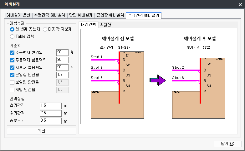 즉 검토모델과 지반고 및 굴착고가 달라 지보재의 배치를 다르게 해야 하는 경우 (새로운 검토단면) 수직간격 예비설계를 수행합니다. 종단상에서 검토단면을 결정해야 하는 경우 수직간격 예비 설계를 통해 위험단면을 빠르게 결정할 수 있고, 또 그 모델을 쉽게 생성할 수 있습니다.(선정안을 다른 이름으로 저장 기능)
