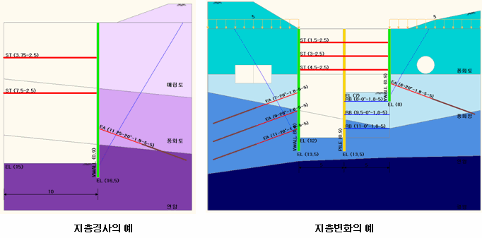 : 아래와 같이 다양한 지층의 경사변화를 입력할 수 있습니다. 이 기능은 FEM 해석만을 수행하는 경우에 사용할 수 있습니다.