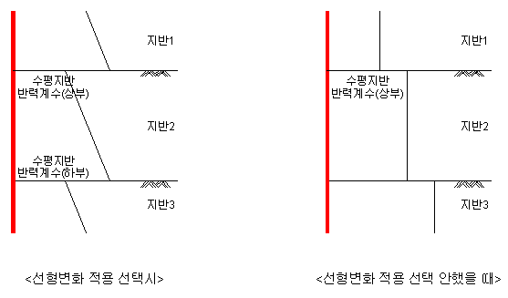 선형변화 적용 선택시 동일한 지반내에서 깊이에 따른 물성치 값들의 변화가 가능하며 지반내의 값들은 직선보간법으로 구합니다.