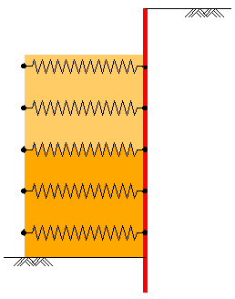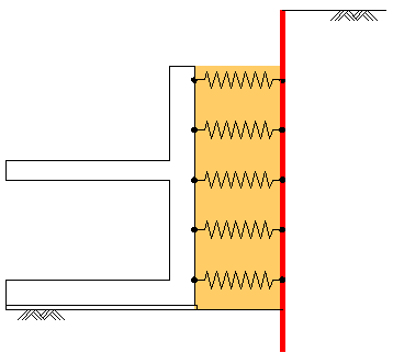 - 흙막이벽체와 구조물벽체 사이의 뒤채움 흙을 지반탄성스프링으로 연결하고 그 강성은 다음과 같이 구합니다.