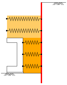- 해체단계 검토시 굴착부를 되메움하여 흙막이벽체에 토압작용이 없는 지반탄성스프링을 연결하여 해석하며, 그 강성은 되메움 지반 정의시 입력한 수평지반반력계수로 계산합니다. 지반 정의시 되메움의 하단깊이를 입력하여 하나 이상의 되메움층을 고려할 수 있으며, 시공 심도별로 벽체 및 슬래브의 뒤채움과 혼용하여 모델링할 수 있습니다.