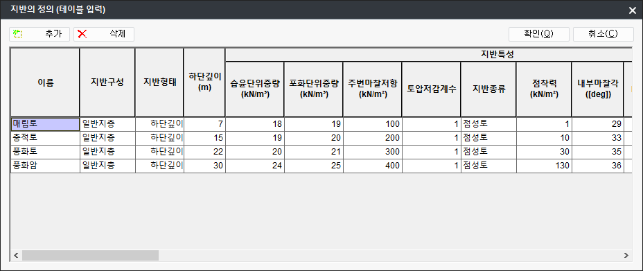 - 가시설 모델 구성을 위해 입력한 지층별로 정렬됩니다. 원지반의 데이터는 깊이별로 정렬되며, 지반개량/뒤채움 용도로 정의한 지층은 하단에 정렬됩니다. 해당 지층을 선택후 지반데이터를 수정하거나 삭제할 수 있습니다.