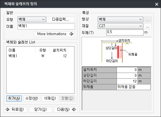 벽체와 슬래브는 지보재의 해체단계를 고려하여 순차적으로 시공되지만, 본 입력창에서는 완성된 최종상태의 벽체와 슬래브를 정의합니다.