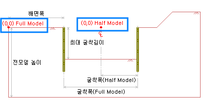 시작위치/끝위치 : 전단면/반단면 모델의 좌표기준은 아래와 같습니다. 아래 그림의 "0, 0" 점을 기준으로 위치를 입력합니다.