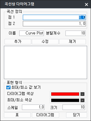 - 곡선 정의 : 점1을 한번 클릭하여 텍스트상자가 연녹색으로 반전되면, 마우스를 이용해 화면상의 두 점을 선택합니다. 두 점으로 연결된 선(Curve)에 Diagram 으로 결과를 출력합니다.