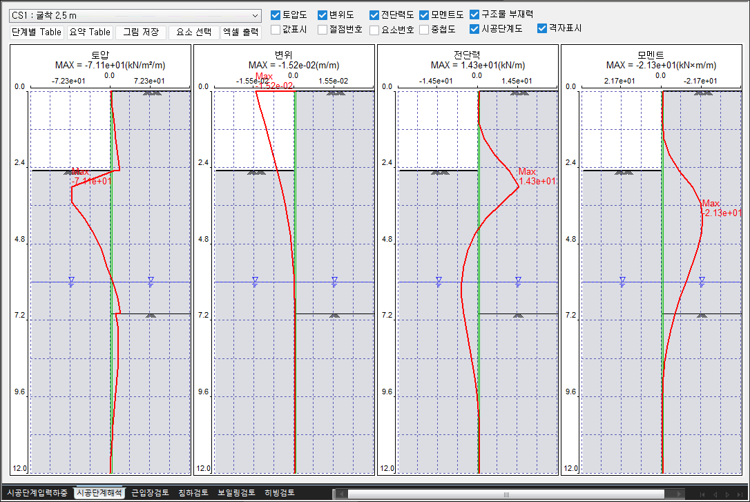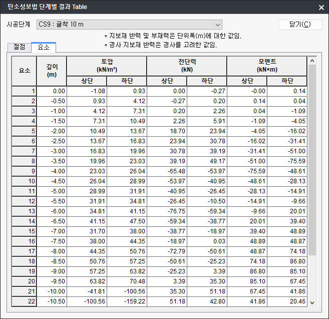 : Diagram에 출력된 토압, 변위, 전단력, 모멘트 항목의 결과값을 시공단계별 테이블 형태로 출력합니다. 테이블의 데이터는 Copy & Paste로 Excel과 호환이 가능합니다.