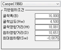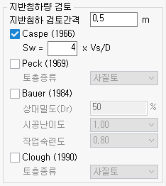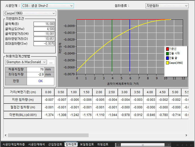 - 침하검토 : 굴착으로 인한 인접구조물의 영향을 파악하기 위해 지반침하를 검토합니다. Caspe, Peck 등으로 부터 제안된 경험식을 사용하며, 침하검토 여부는 해석옵션에서 선택합니다.
