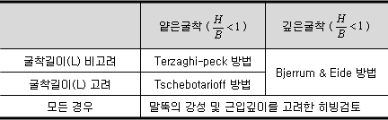 - 히빙은 굴착깊이와 굴착길이를 고려하여 Terzaghi-peck 방법, Tschebotarioff 방법, Bjerrum & Eide 방법 등의 제안식으로 검토합니다.
