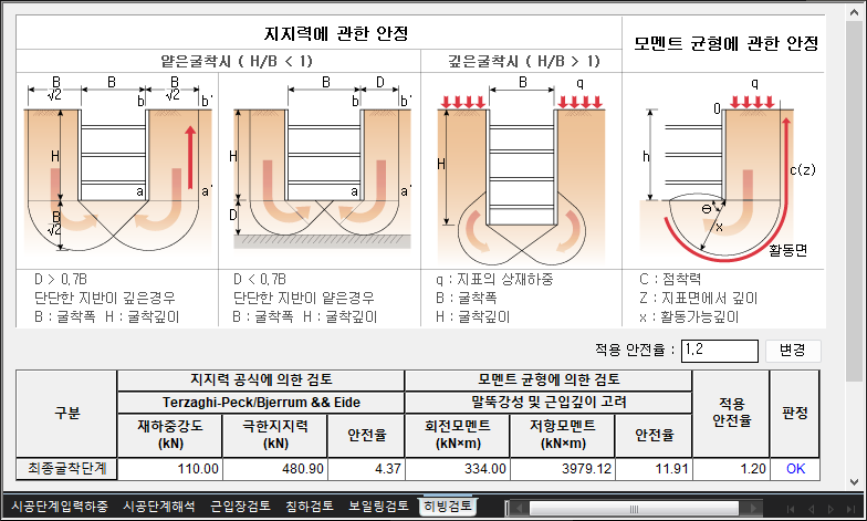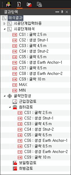 - 탄소성보해석의 결과는 크게 "시공단계해석"과 "굴착안정성검토" 두가지로 구분할 수 있으며, 굴착안정성검토는 "근입장검토", "침하검토", "보일링검토", "히빙검토"로 이루어져 있습니다.