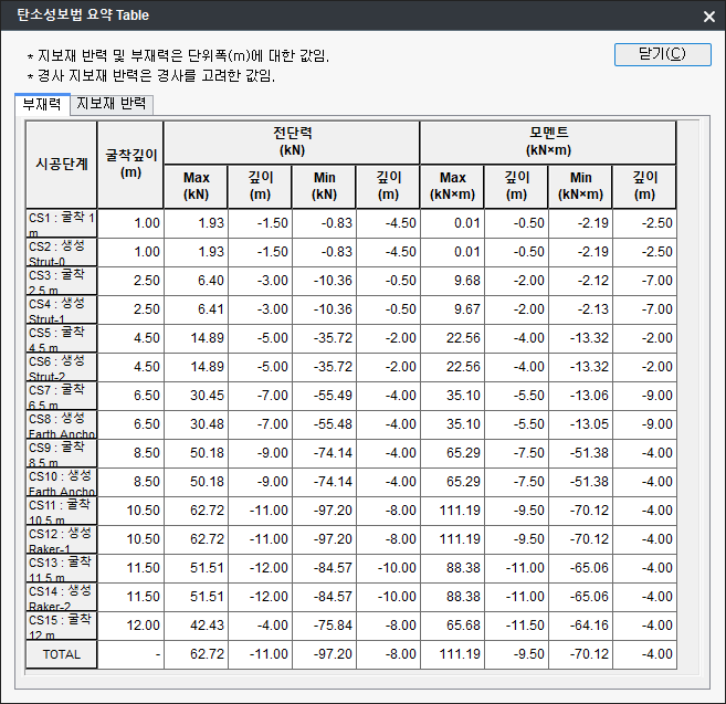 : 탄소성보법에 의한 흙막이벽의 최대/최소 부재력, 지보재 반력 결과를 시공단계별로 요약하여 테이블 형태로 출력합니다. 테이블의 데이터는 Copy & Paste로 Excel과 호환이 가능합니다. 탄소성보법에서는 지보재를 흙막이벽체에 연결된 스프링으로 모델링하기 때문에 스프링지점의 반력으로 출력됩니다.