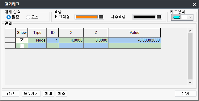 임의 절점이나 요소에 꼬리표를 붙여 결과값을 나타냅니다. 표시해야 할 주요한 지점에 결과태그를 부착하여 해석결과를 효과적으로 표현하도록 도와줍니다. -