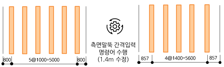 주2) 측면말뚝 자동정렬 기능을 적용한 흙막이 벽체의 측면말뚝 간격은 중심에서부터 배치되어 양 끝단에 여유길이를 갖는 시스템으로 측면말뚝을 배치합니다.
