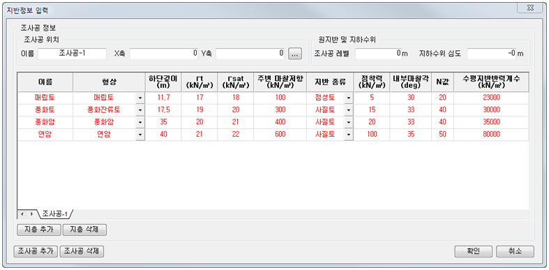 - (1) 지반정보 입력창을 통해 조사공 및 지층을 추가 입력합니다.