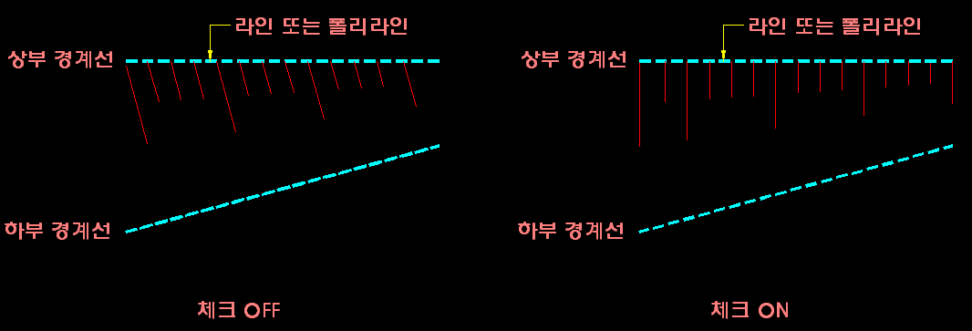 비탈면 상부 경계선 기준 그리기체크 On과 Off의 차이는 아래 그림과 같습니다. -