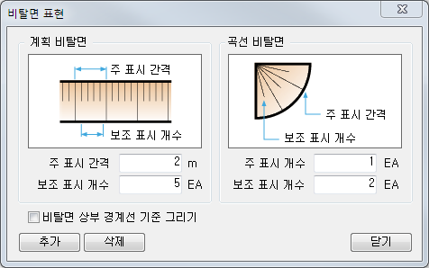 (4) 비탈면 표현 작도 방법을 두 개의 선을 이용하여 자동으로 표현됩니다. 비탈면 표현을 모델링시와 성과물에 별도로 표현하지 않기를 원하면