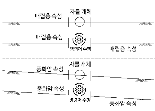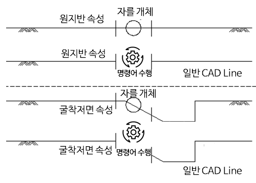 - 원지반선, 굴착저면, 지하수위, H-Pile 사장라인은 전개도에서 하나의 선만 존재할 수 있으며, 라인 양끝단을 Trim할 경우에는 문제가 없습니다. 그러나 중간부분을 Trim할 경우 앞 부분 선은 속성으로 부여되고 뒤 부분 선은 CAD 객체로 부여됩니다.