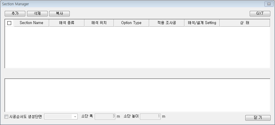 - 단면리스트에서 FEM 해석을 선택한 경우에는 해석 및 설계 수행이 되지 않으나 선택된 단면 모델 데이타를 GXT로 생성시켜 주는 기능입니다. GXT의 자세한 내용은 GeoXD Analysis 온라인 매뉴얼을 참고하시기 바랍니다.