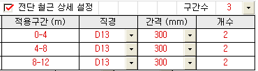 전단 철근 상세 설정을 체크하면 임의의 구간별로 각각 다른 직경, 간격, 개수의 전단철근을 적용할 수 있습니다. 전단 철근 상세 설정 내용은 설계와는 연동되지 않고 도면 생성과 수량산출에만 영향을 줍니다.