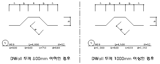 5철근은 D-Wall 800 mm 이하인 경우에는 전체 철근길이가 4000 mm, 1000 mm이상인 경우에는 전체 철근길이가 4500 mm로 고정되어 있습니다. D-Wall 두께에 따라 a,b,c,d가 변경되며, a는 D-Wall 두께, b는 D-Wall두께 (피복두께*2)로 구해집니다.D-Wall 두께 전체 철근 길이 800 mm 이하 4,000 mm 1,000 mm 이상 4,500 mm 변수 산정 공식 / 설명 a D-Wall 두께 b D-Wall 두께 - (피복두께 * 2) c, d D-Wall 두께에 따라 변경됨