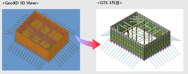 - 가시설 부재 및 지층정보를 GTS 중립파일을 이용하여 3차원 및 2차원을 연동하는 기능입니다.