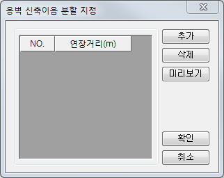 4) 콤보 버튼을 이용하여 옹벽 신축이음 분할 지정에 위치하고 Station에 입력하거나 추가 버튼을 이용하여 전개도 View에서 원하는 신축이음 위치를 지정 합니다.