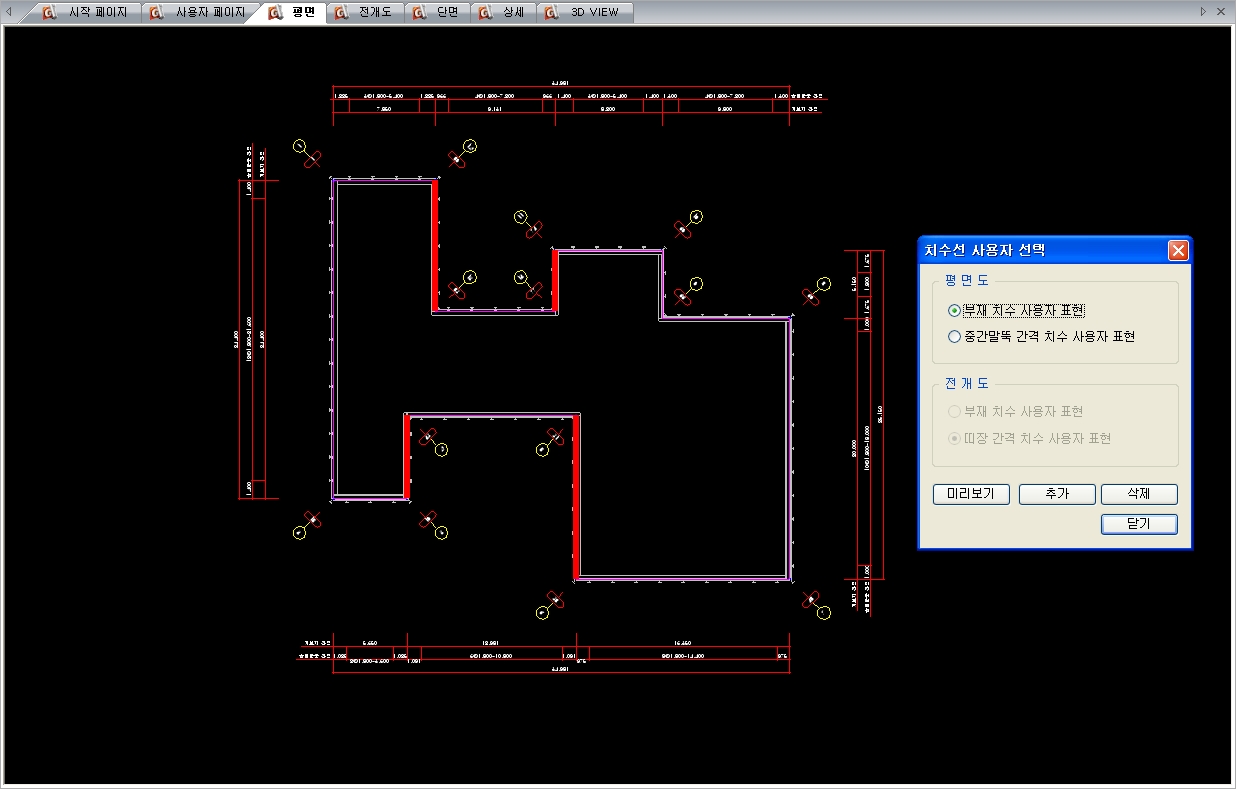 평면 View에서 Work Line을 생성시 변곡점이 내부로 생성되는 경우나 각 최외각 측면에서 바라 볼때 W/L 전체가 보이지 않는 치수선은 프로그램 내부에서 자동으로 생성하고 있지 않습니다. 또한 중간 말뚝 이격거리를 원하는 경우도 포함됩니다. 이런 경우 사용자 정의 치수선을 통해 치수선을 생성 시키는 기능입니다.