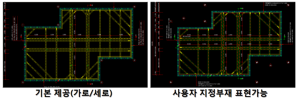 전개도 View에서 전개도 시점과 종점에서만 치수선을 출력하다 보니 전개도 중앙부에서 지보단의 이격거리가 다른 경우 알아 보기 어려우므로 전개도 지보단 치수선을 생성 시키는 기능입니다.