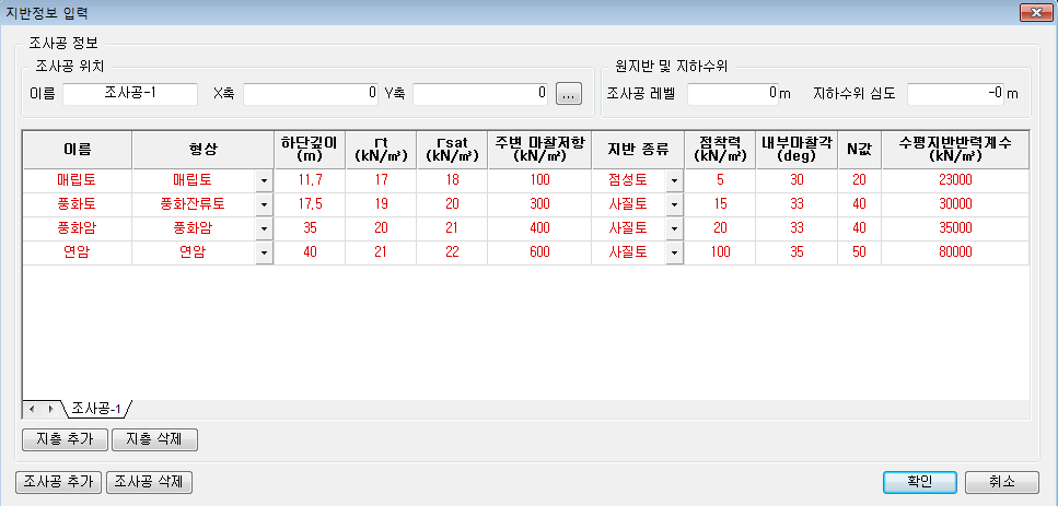 - 각각의 조사공에서 해당 지층을 추가하거나 삭제할 수 있습니다.
