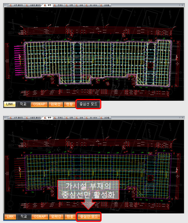 중심선 모드 : 평면탭에 적용된 가시설 부재의 중심선만을 활성화시킨상태로 모델링을 작도할 수 있도록 하였습니다. 가시설 부재의 범위 및 크기가 광범위해지는 경우 모델링 속도를 더욱 유용한 기능입니다.