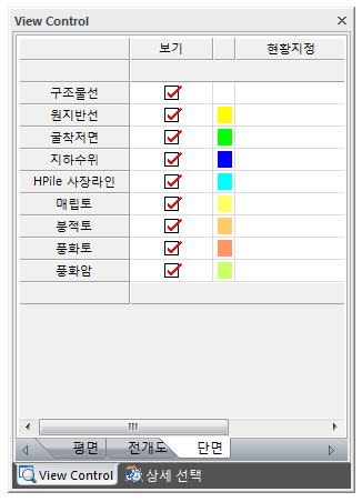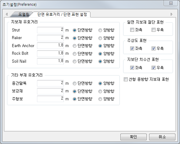 단면 표현 설정은 일면 지보재 절단 , 주상도, 굴착 심도 치수선 등의 표현을 체크 On / Off를 통해 보다 좋은 단면 표현과 도곽 내에의 공간을 최대한 활용하여 성과물 출력시 수정 작업이 없도록 하는 기능입니다.