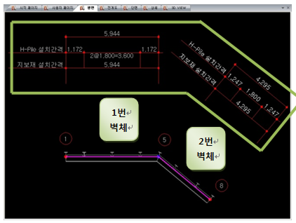 연결된 벽체가 사이의 각도가 연속 벽체 기준각도 값보다 작은 경우는 내부적으로 연속된 벽체로 인식합니다. 연속된 벽체로 인식되면 두 개의 선분이 만나는 점에 측면말뚝이 배치되지 않고, 두개의 선분에 걸쳐 연속적으로 측면말뚝이 배치됩니다. 또한 치수선도 각각의 선분별로 표현되지 않고 연속벽체로 인식된 벽체 전체의 치수선이 하나로 표현됩니다.