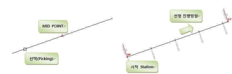 (5) "선형지정"은 아래 그림과 같이 "선형 객체 선택"시 선택한 라인의 중심점을 기준으로 어느 쪽을 선택(picking)하는지를 판단합니다. 따라서 사용자가 선택한 쪽의 끝점을 사용자가 입력한 "시작 Station"값으로 설정하고 선형을 진행시킵니다.
