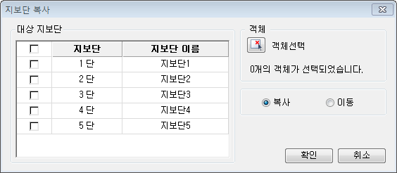 - "홈 메뉴 탭 > 기본 설정 패널 > 지보단/현황 설정"에서 설정한 지보단 층이며, 선택한 지보재 및 보강재/브레이싱 객체를 복사 또는 이동할 지보단을 Check합니다.