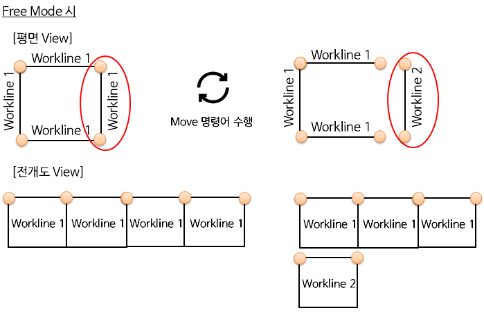 주4) 폐합된 흙막이 벽체에서 Free Mode시 한면의 흙막이 벽체를 이동하게 되면 2개의 흙막이 벽체 및 전개도가 생성됩니다. 이 때 Workline번호는 길이가 긴 쪽이 번호 우선이 됩니다. Break Workline 명령어를 수행하지 않은 상태에서 다시 이동한 한면의 흙막이 벽체를 붙이면 다시 하나의 폐합된 흙막이 벽체 및 전개도로 전환됩니다.