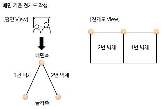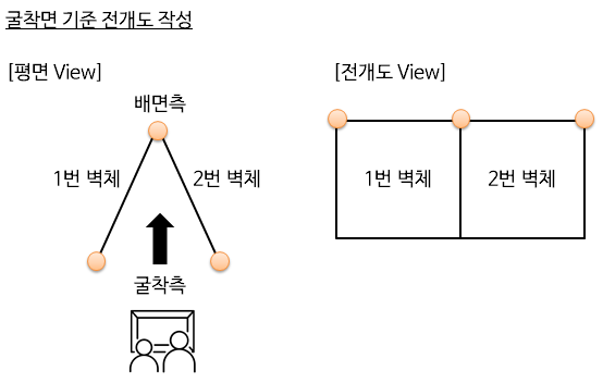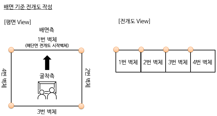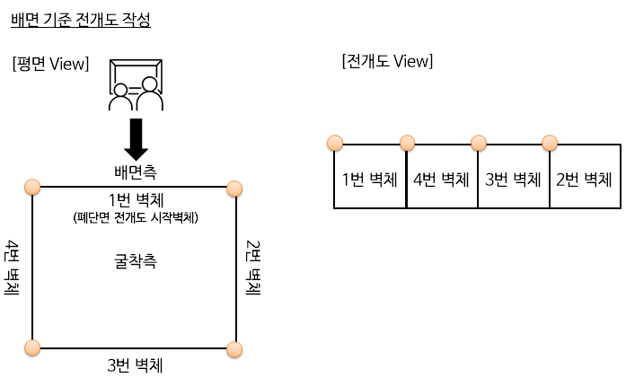 - 굴착면 기준 : 전개도 작성 방향이 굴착면에서 사람이 바라보는 방향으로 작성됩니다.