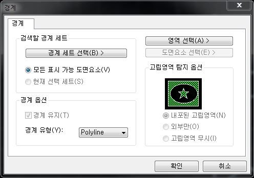 - 경계를 유지여부와 만들어진 경계를 어떤 객체 유형(영역 또는 폴리선)으로 작성할 것인지 선택합니다.