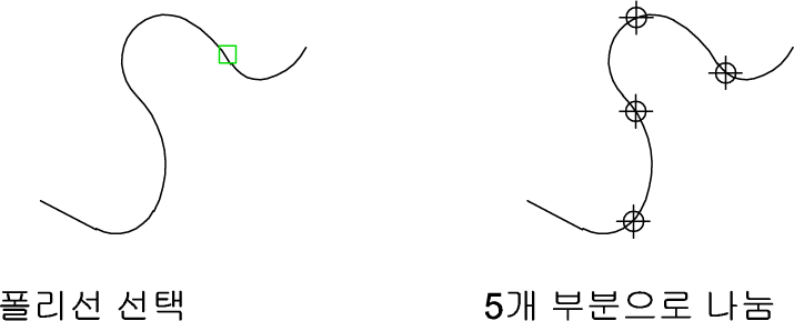 - 선택한 객체를 지정한 수만 큼 분할 합니다. 분할 위치에는 점 또는 지정한 블록이 표시됩니다.
