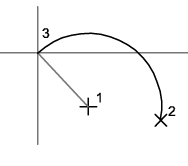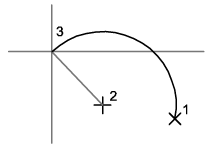 - 시작점(2)으로부터 시작하여, 중심점(1)에서 지정된 점(3)을 지나 그려진 가상의 광선에 놓여 있는 끝점까지 시계 반대 방향으로 호를 그립니다.