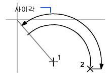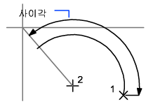 - 지정한 사이각과 함께 중심점(1)을 사용하여 시작점(2)으로부터 시계 반대 방향으로 호를 그립니다. 각도가 음수이면 시계 방향으로 호를 그립니다.
