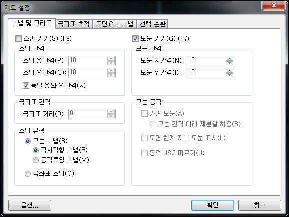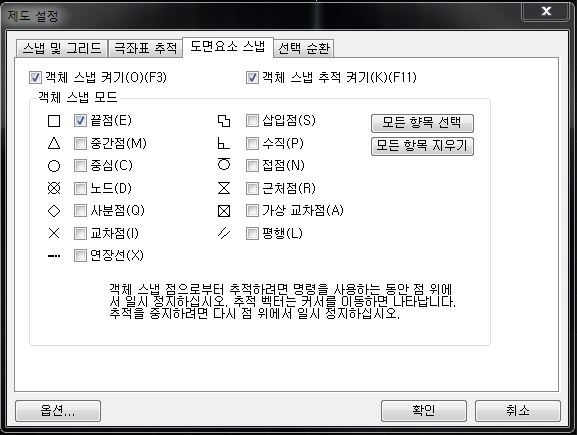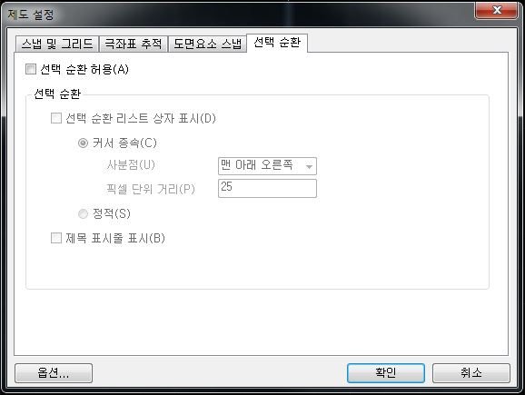 - 스냅 및 그리드, 극좌표 추적, 도면요소 스냅 및 선택 순환과 같은 도면 도구용으로 구성되는 제도 설정을 지정합니다.