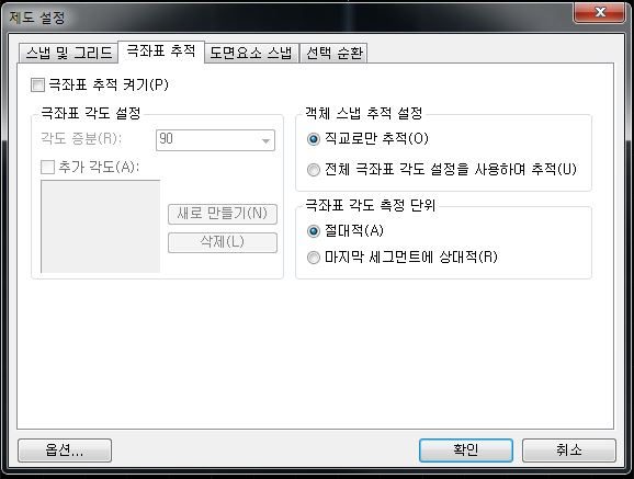 - 극좌표 추적 설정을 객체 스냅 추적에 적용합니다. 객체 스냅 추적을 사용하면 커서가 지정된 객체 스냅 점에서 극좌표 할당 각도를 따라 추적합니다. (POLARMODE 시스템 변수)