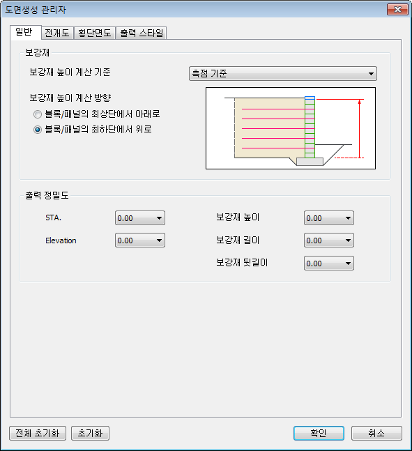 - 보강재 높이 계산 방향이 “블록/패널의 최하단에서 위로”인 경우 횡단면도는, 각 측점별 / 각 단별로 최하단 블록 또는 패널의 하단고를 기준점으로 계산합니다.