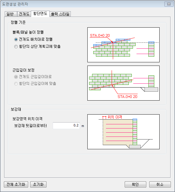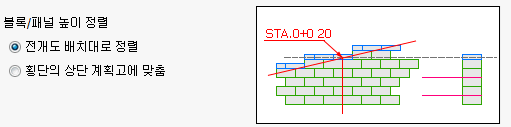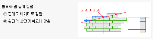 - 블록/패널 높이 정렬 옵션은 횡단면도 작도시 상단 계획고 라인에 블록을 배치할 때 전개도 배치와 동일하게 배치할 것인지, 횡단의 상단 계획고에 블록(또는 캡)/패널의 상단이 정확히 일치하도록 배치를 조정할 것인지를 설정합니다.