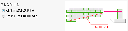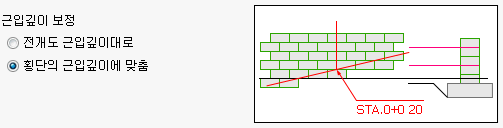 - 블록/패널 높이 정렬 옵션이 “횡단의 상단 계획고에 맞춤”일 때 활성화 되는 근입깊이 보정 옵션은 횡단면도 작도시 하단의 블록/패널과 기초의 위치를 결정하기 위한 옵션입니다. 블록/패널 높이 정렬 옵션을 통해 상부에서 이미 블록의 위치를 아래로 조정했기 때문에, “전개도 근입깊이대로” 옵션의 경우는 전개도 상의 근입깊이 위치에서 블록/패널을 강제로 컷팅한 후 기초를 위치 시키고, “횡단의 근입깊이에 맞춤” 옵션의 경우는 상단에서 블록/패널의 위치를 아래로 조정한 만큼 동일하게 기초의 위치도 아래로 조정하게 됩니다.