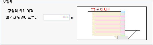 - 보강영역 위치 이격 옵션은 횡단면도 작도시 보강재의 길이 뒤로 사용자가 입력한 값 만큼 이격시켜 보강영역을 작도하는 설정입니다.