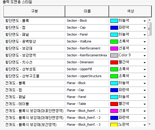 - 출력되는 도면의 도면층에 대한 이름과 색상을 설정합니다.